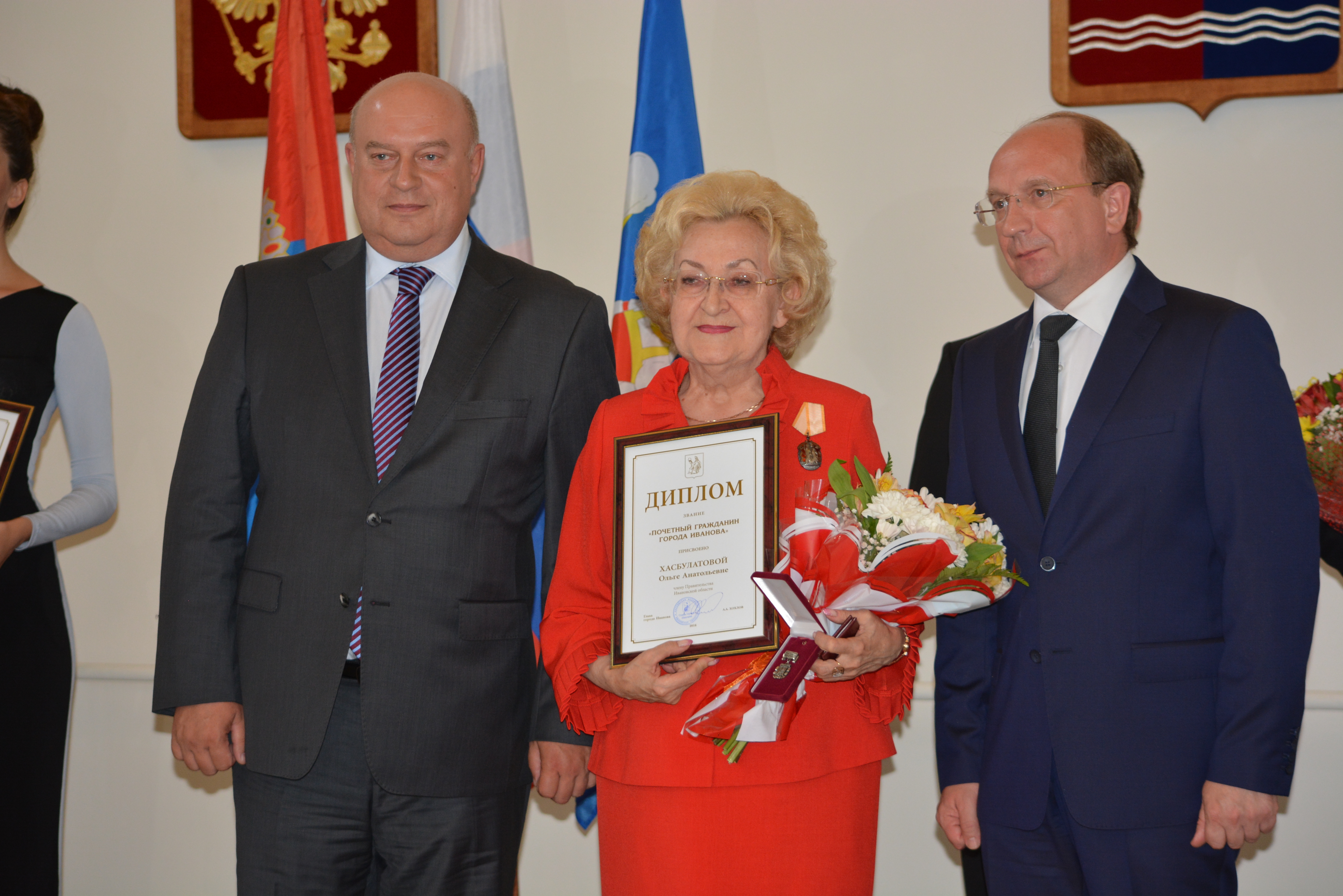 | Алексей Хохлов дал старт официальным мероприятиям Дня города Иванова Накануне общегородского праздника в Белом зале музея им Д.Г. Бурылина прошел торжественный вечер «С любовью к городу!». На него приглашены почетные граждане города, руководители общественных организаций, ветераны, члены Общественного совета города Иванова. В 2016 году 27 человек участвовало в конкурсе на соискание звания лауреата Знака «Общественное признание». Решением депутатов Ивановской городской Думы знака удостоены 13 человек в девяти номинациях: «Моя малая Родина» - Альфия Кузьмичева, председатель совета ТОС «Дружный»; «Сердце отдаю людям» - Валентина Кулдошина, председатель Совета ветеранов Меланжевого комбината; «Человек-легенда» - Николай Быстров, полковник милиции, председатель Совета ветеранов г. Иванова; «Социальная ответственность – гарантия успеха» - Марина Панина, директор Центра дополнительного творческого и гуманитарного образования «Элита», и Елена Федосеева, индивидуальный предприниматель; «Открытое сердце» - Ивановское областное отделение международного общественного фонда «Российский фонд мира»; «Покой нам только снится» - Татьяна Бельцова, ветеран труда, член Совета ветеранов г. Иванова; «Будущее города мы создаем сегодня» - Юрий Марфин, доцент кафедры неорганической химии ИГХТУ; «Всю душу отдаю детям» - Анастасия Ситнова, зам. директора гимназии № 36 г. Иваново; «Патриот земли Ивановской» - Евгений Смирнов, директор Ивановского филиала РАНХиГС, и Александр Тихомиров, краевед, доцент кафедры ботаники и зоологии ИвГУ. Награды лауреатам вручили заместитель главы Администрации г. Иванова Сергей Золкин и заместитель Председателя Ивановской городской Думы Татьяна Петрова. Также Знака «Общественное признание» в номинации «Покой нам только снится» удостоены Ольга Егорова, председатель КЛБ «Автокрановец», и Виктор Соколов, преподаватель кафедры истории и культурологии гуманитарного факультета ИГХТУ, председатель областного совета ветеранов журналистики и печати. На прошедшем торжественном вечере заместитель главы Администрации города Иванова Владимир Пигута вручил свидетельство лауреата городской литературной премии имени поэта Владимира Жукова поэту Сергею Сайкину. Сергей Владимирович занимается поиском воинов-ивановцев, не вернувшихся с полей сражений Великой Отечественной войны, он автор десяти документально-очерковых книг. Глава города Иванова Алексей Хохлов и Председатель Ивановской городской Думы Александр Кузьмичев вручили Знаки отличия «За заслуги перед городом Ивановом» бессменному руководителю эстрадной вокальной студии «А+Б» Татьяне Охомуш. Звание присвоено также Почетному строителю России, директору предприятия «Ивсиликат» Владимиру Толдину. Завершилось и мероприятие вручением Серебряных знаков Почетным гражданам города Иванова. В этом году это звание присвоено профессору ИвГУ, руководителю аппарата Правительства Ивановской области Ольге Хасбулатовой и генералу-майору внутренней службы, начальнику Ивановской государственной пожарно-спасательной академии МЧС РФ Игорю Малому. «Во все времена впереди шел тот, кто не боялся принимать нестандартные решения, кто был искренне увлечен своей работой и был верен ей до конца. Эти слова по праву можно отнести к почетным гражданам города Ольге Анатол