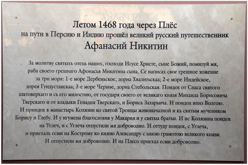 На одной из них высечены первые строки «Хожения за три моря» Афанасия Никитина, посвященные его прибытию в Плёс в 1468 году. О путешествии Афанасия Никитина в Индию помнят и спустя почти шесть веков, изучая его как памятник литературы и географии.